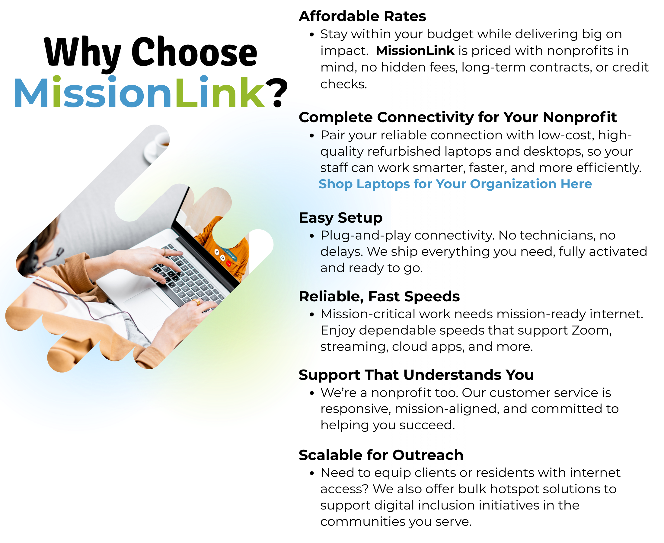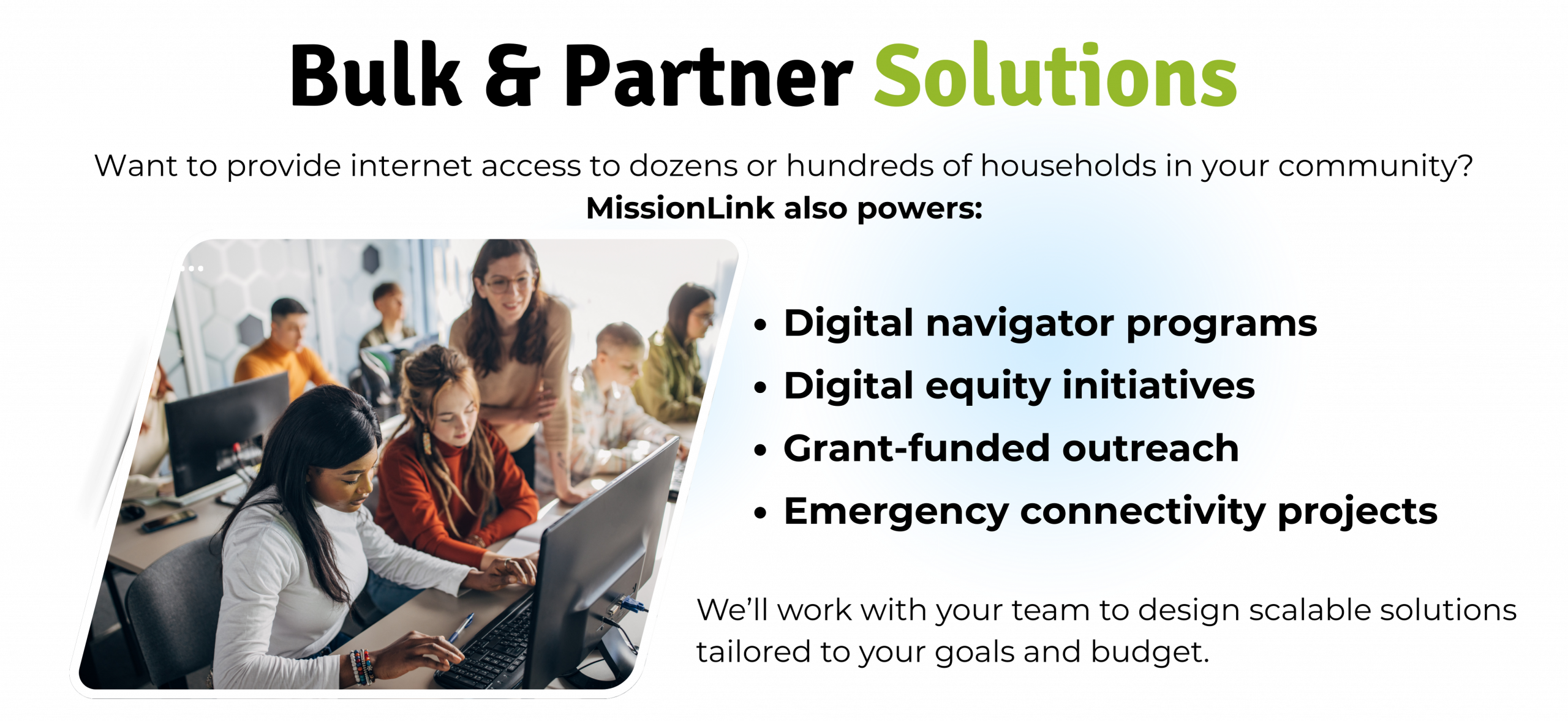 We are proud to work with nonprofits, schools, housing authorities, local government, and other community organizations across the country to provide low-cost internet access. We know how tight budgets can be and never want a high price tag to be a barrier for people seeking to secure internet access for their community.