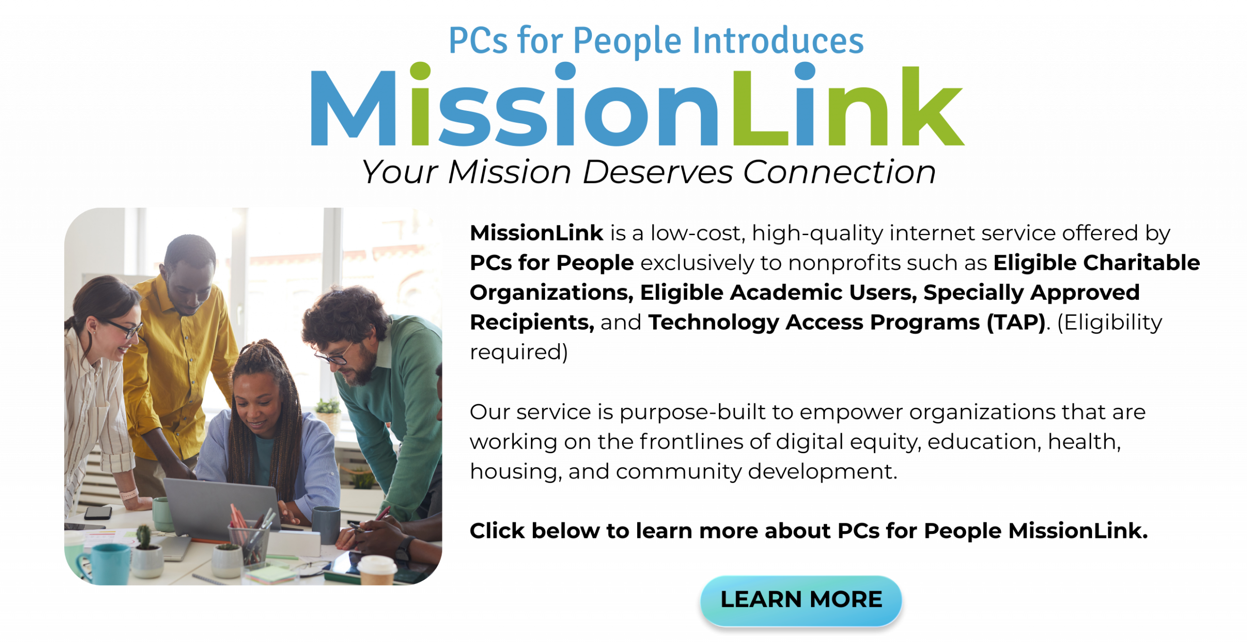 PCs for People is a national nonprofit social enterprise working to get low-cost quality computers and internet into the homes of individuals, families, and nonprofits with low income. By recycling and then refurbishing computers, PCs for People provides a valuable service to businesses, families, and the planet by keeping computers out of landfills and repurposing them to advance digital inclusion.